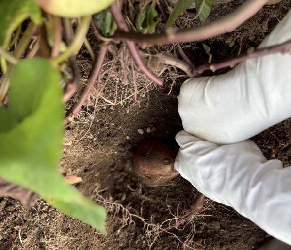 両手で一生懸命さつまいもを掘り
