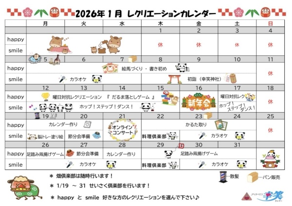 1月レクリエーションも盛り沢山になっております(*^_^*)今月も皆様と一緒に楽しい月にしたいと思います(*´∀`)♪ #1月 #レクリエーション #レクリエーションカレンダー #デイサービス幸笑 #デイサービス #栃木県 #宇都宮市 #平松